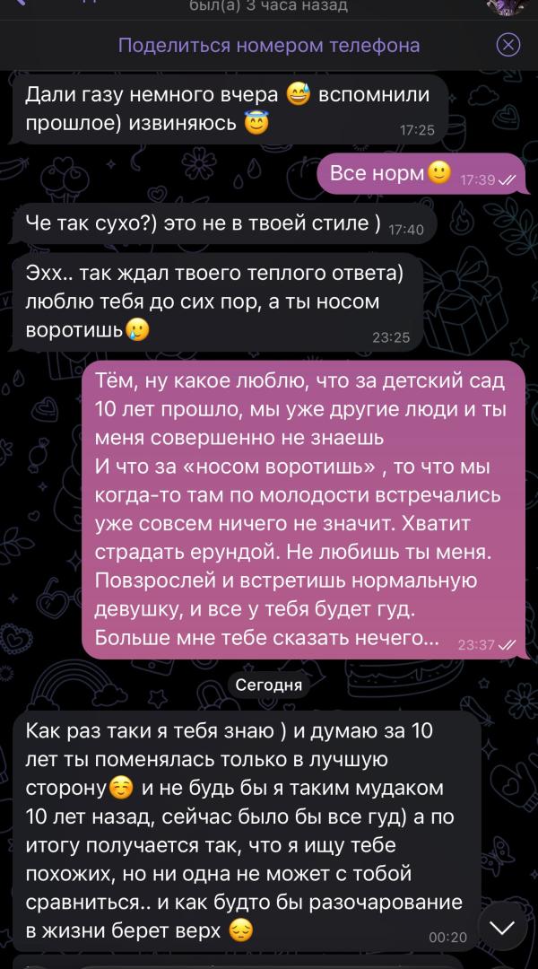Встречались 2,5 года с парнишкой в 15-16 лет. Сейчас нам уже по 30 лет. И вот такие сообщеньки строчим…