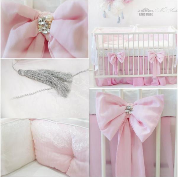 набор для девочки. в комплекте все, что на фото,( бортики на 3 бока,одеяло 80*100,маленькая подушка,простынь на резинке и юбочка с бантами) 7 тыс. руб.