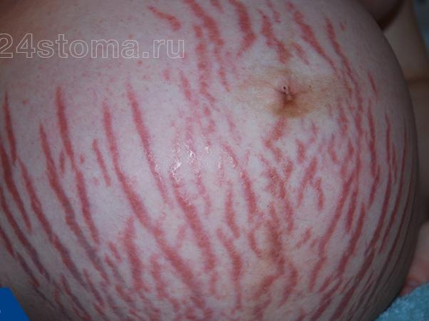 Свежие растяжки имеют оттенки розового цвета (что обусловлено воспалительными процессами, сопровождающими их появление) или синюшного (вызванного просвечиванием кровеносных сосудов сквозь истонченную кожу). Они даже могут немного возвышаться над поверхностью кожи.