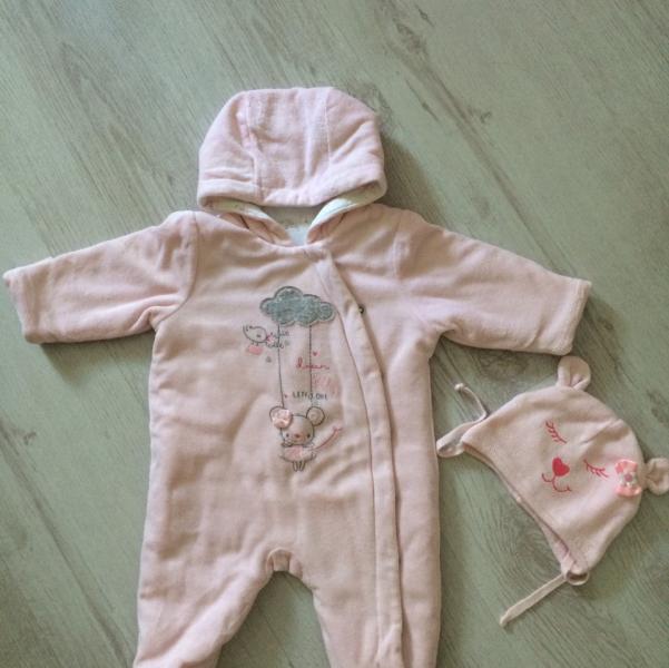 Mothercare комбинезон на 0-3 мес(62 размер). Мы носили до 4х мес. В идеальном состоянии. Никаких следов носки. Горло хорошо закрывает. Шапка продана. 1000 руб