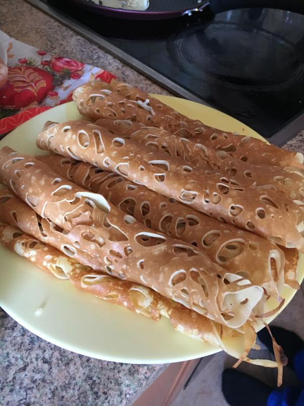 @milana05, @eka416, взял бутылку 0,5. Сделал дырки в крышке. Залил в бутылку тесто, и на раскалённую сковородку лил(круговыми движениями вроде) и потом завернул). можно в интернете посмотреть, кажется "ажурные блинчики из бутылки"