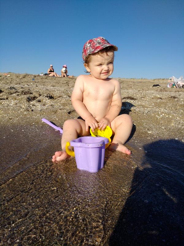 Первый заплыв прошел отлично. Сначала чуток Костик постоял не понял что вообще происходит . На песок с ракушками бегал и говорил кака😂 даже ноги поднимал и просил снять песок с ног))