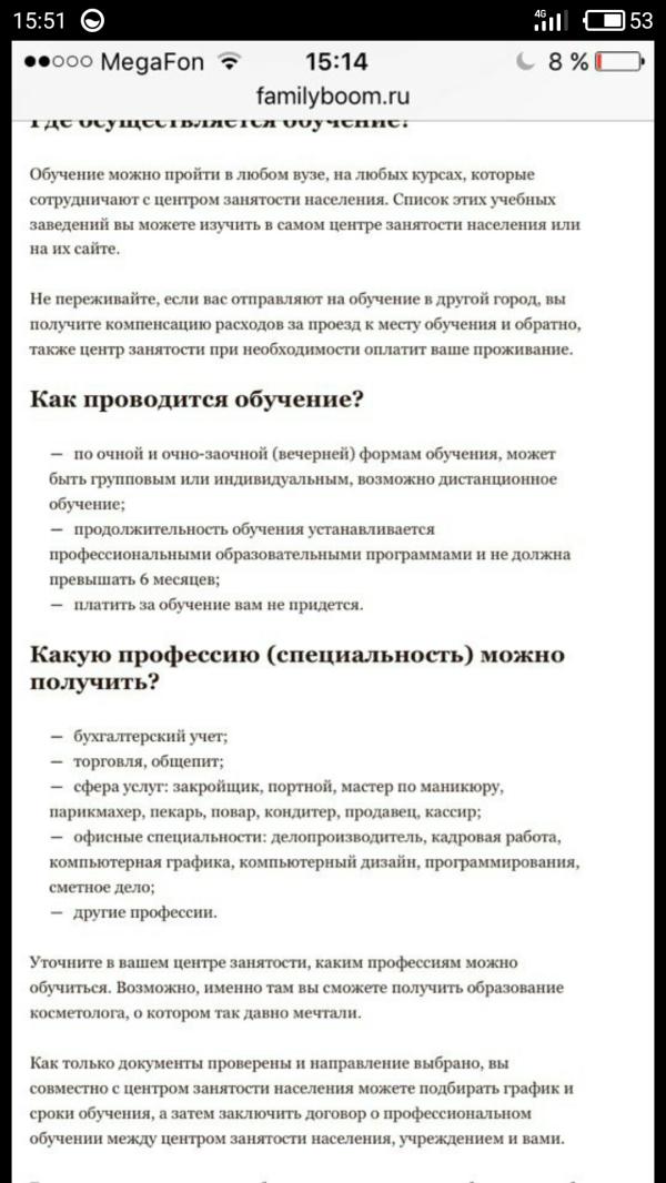@filippi_666 центр занятости смотрит на основной диплом и отправляет на обучение в ту же сферу. Например, ц меня диплом экономиста, работала аудитором. Меня отправили на курсы бухучета. На курсы парикмахеров или пекарей меня не пустили, потому что отучиться"для себя" это им не надо. Им нужно отчитаться за потраченные деньги и показать,что Декретницы после обучения вышли ( нашли новую) на работу