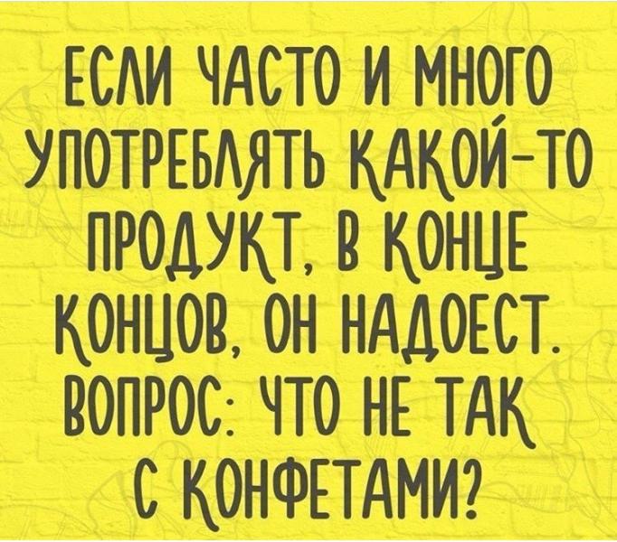 Так конфеты вы же каждый раз разные едите😀 я несколько лет фанатела от определенной марки конфет, прям оторваться не могла (хотя вообще с шоколадом в обычных теплых отношениях, без страсти😆). Так вот ела-ела пару лет, потом как отбило- больше года не хотелось. И вот только совсем недавно опять начала уничтожать пачками😤