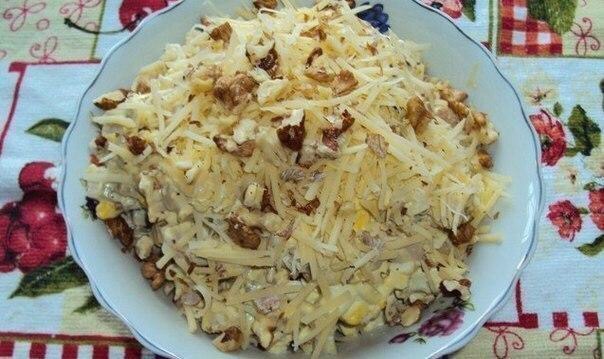 Смешайте все нарезанные составные салата, добавьте тертый сыр, и заправьте все это майонезом. Выложите салат «Сытый гость» в красивое блюдо, и украсьте его тертым сыром и орехами.