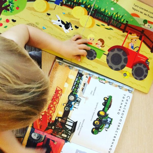 А потом, листая книжки с изображением экскаваторов, тракторов, автокранов, грузовиков и прицепов изображает как они «трудятся». Говорит пока Семён очень мало и неохотно, зато жестикуляция отличная👍🏻🖖🏻😹.