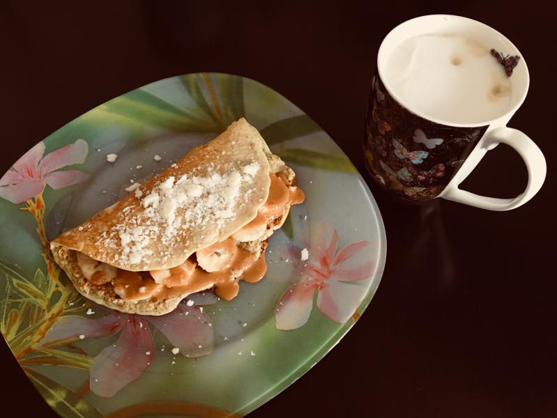 Яйцо, два ст ложки молока, 2-3 ст ложки овсяных хлопьев, щепотка соли, сахар по желанию (я добавила немного тростникового), перемешать, оставить на 5 минут и на сухую горячую сковородку.