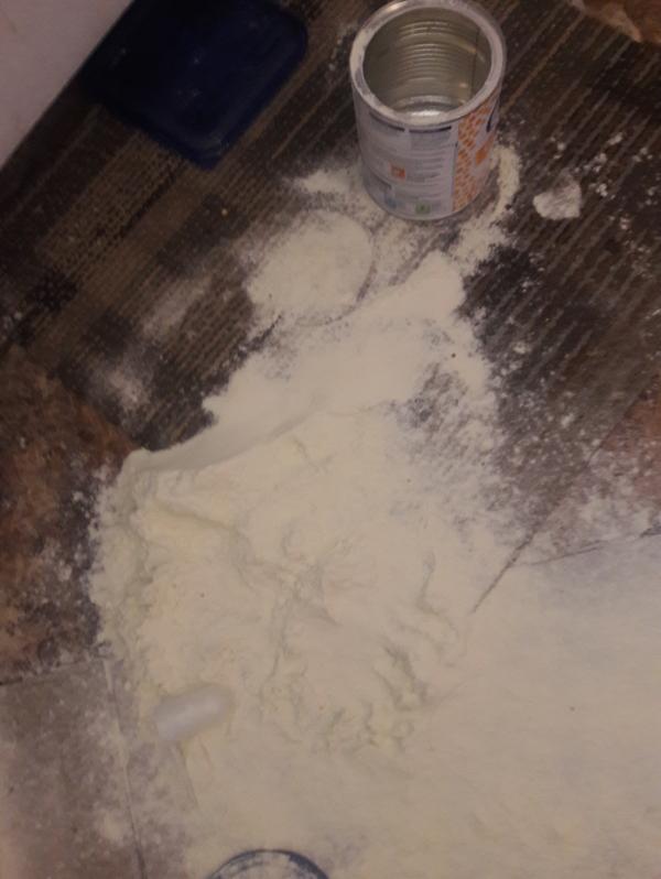 ???????????? I went to the restroom for just a couple minute...... My son got my daughters formula off of the counter and now its all over the floor. I want to cry. It was all I had right now. And it was a brand new can.