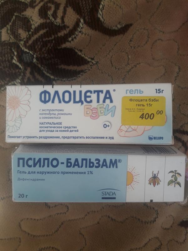 Наше спасение после укусов-Псилобальзам-разрешен с 2 лет и гель Флоцета-разрешен с рождения.Снимает отек,зуд,охлажлаждает кожу,успокаивает место укуса.Очень хорошие средства.Спасаемся ими уже несколько лет