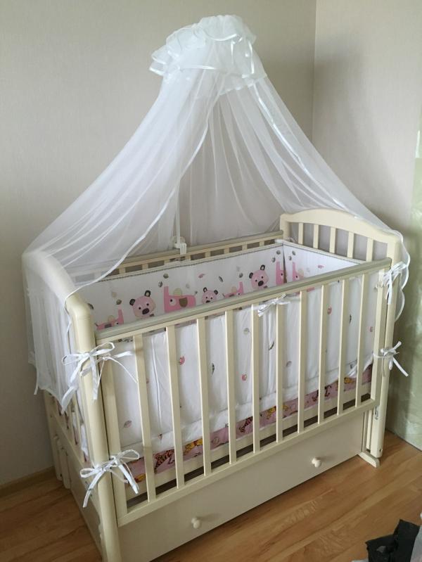 Вместительный ящик для белья, прдольный маятник со стопром, убираются прутья для ребенка по-старше, стенка регулируется по высоте. Матрас ортопедический в подарок и намотрасник ( без пятен ). Есть новый комплект белья для девочки (он на фото) 2000 рублей.