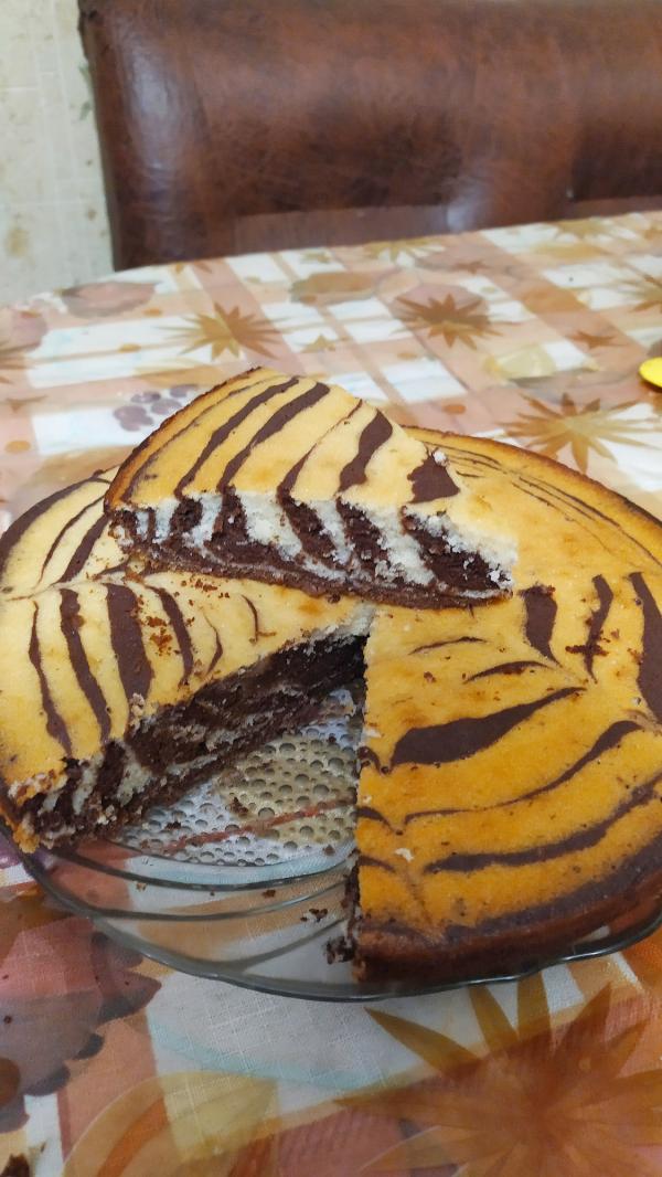 7. Можно сделать такой узорчик с помощью ножа или зубочистки. Выпекать пирог «Зебра» на сметане при 180 градусах примерно 40-50 минут. Время зависит от вашей духовки. Кекс будет готов, если проткнув его по центру вы получите сухую зубочистку.