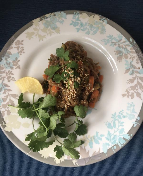 Гречневая лапша с овощами и тушенкой (можно без нее, можно с фаршем, курицей, индейкой). С тушенкой быстрее.