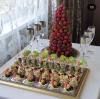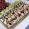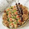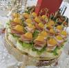 Нарезки с колбасами, мясом, сырами разными. Тарталетки с творожным сыром и красной рыбой. И с крилем и креветками. Овощи палочками с тартаром