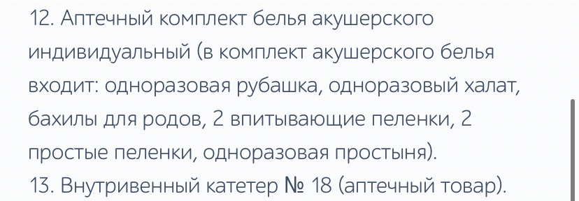 Остальное не надо,сорочку,халат выдадут.второй пункт первый раз вижу вообще.