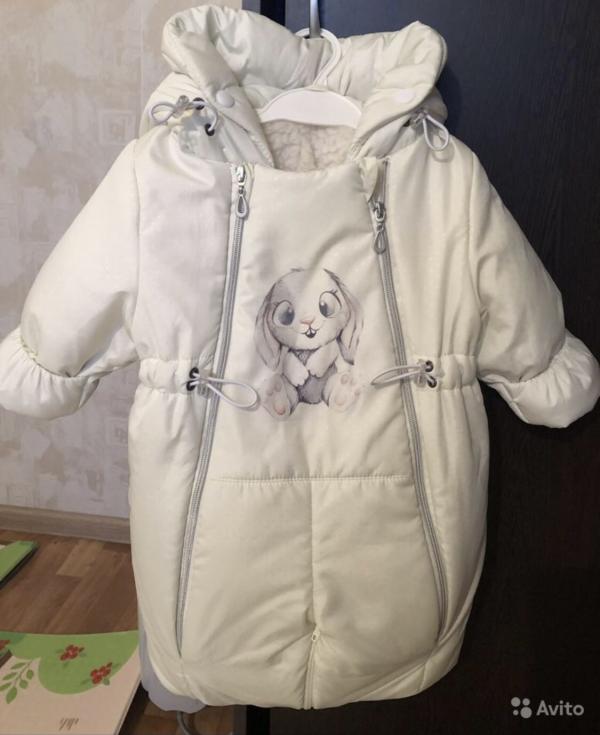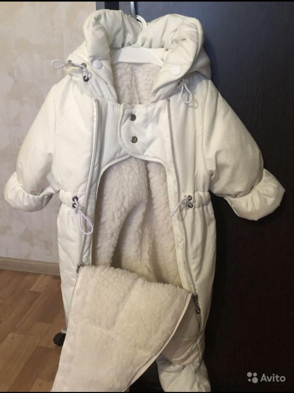комбинезон-трансформер незаменимая вещь для комфортных прогулок в коляске и санках. Шерстяная подкладка обеспечивает малышу тепло и комфорт, два замка молнии позволяют быстро собрать малыша на улицу. Меховая подстежка съемная с волокнами натуральной шерсти 30/70%. Капюшон регулируется утяжками. Низ комбинезона трансформируется из конверта в ножки, пинетки крепятся на кнопки и имеют меховую подкладку в области ступни. По низу рукава защитный клапан-варежка. Рост 74 см. Состояние отличное, в эксплуатации был одну зиму. Без подстёжки подойдёт на весну. Цена 2000р