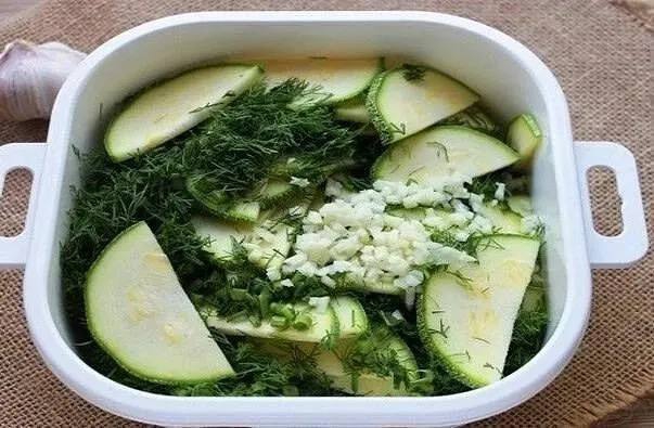 Затем порезанные кабачки уложить слоями в подготовленную емкость, перекладывая каждый слой кабачков зеленью и рубленным чесноком.