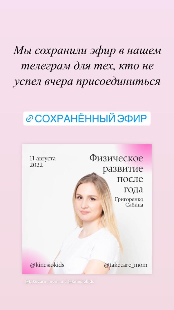 Всем привет! Совсем забыли здесь упомянуть, но ничего страшного) В этот четверг у нас был эфир с двигательным терапевтом из Kinesiokids. Мы сохранили эфир у себя в телеграм. Забейте в поиск @takecaremom и выйдет наш канал💕