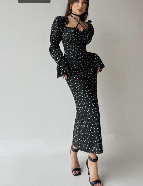Под это платье подходят именно классические черные и базовые босоножки, с открытой щиколоткой,