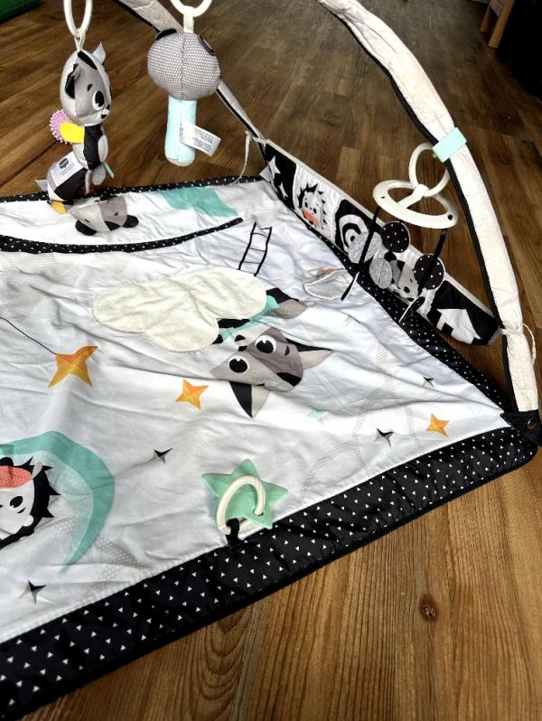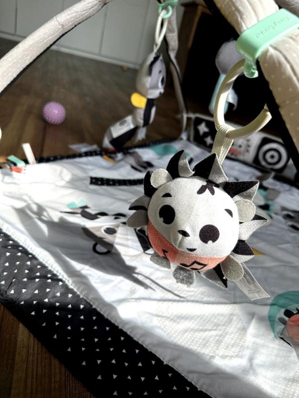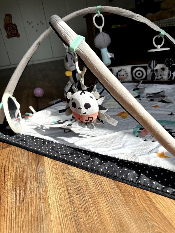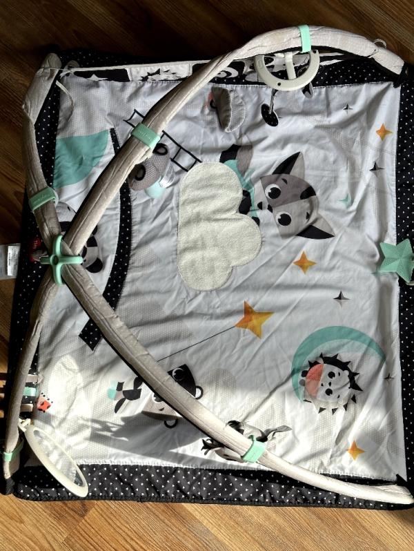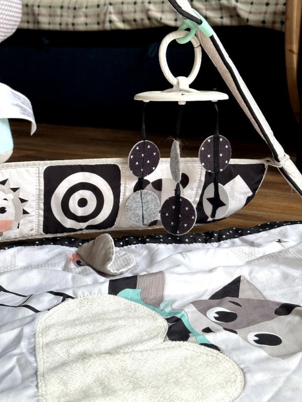 - развивающие элементы встроенные в полотно коврика: плюшевые облако, шуршалка, сатиновые ленточки.