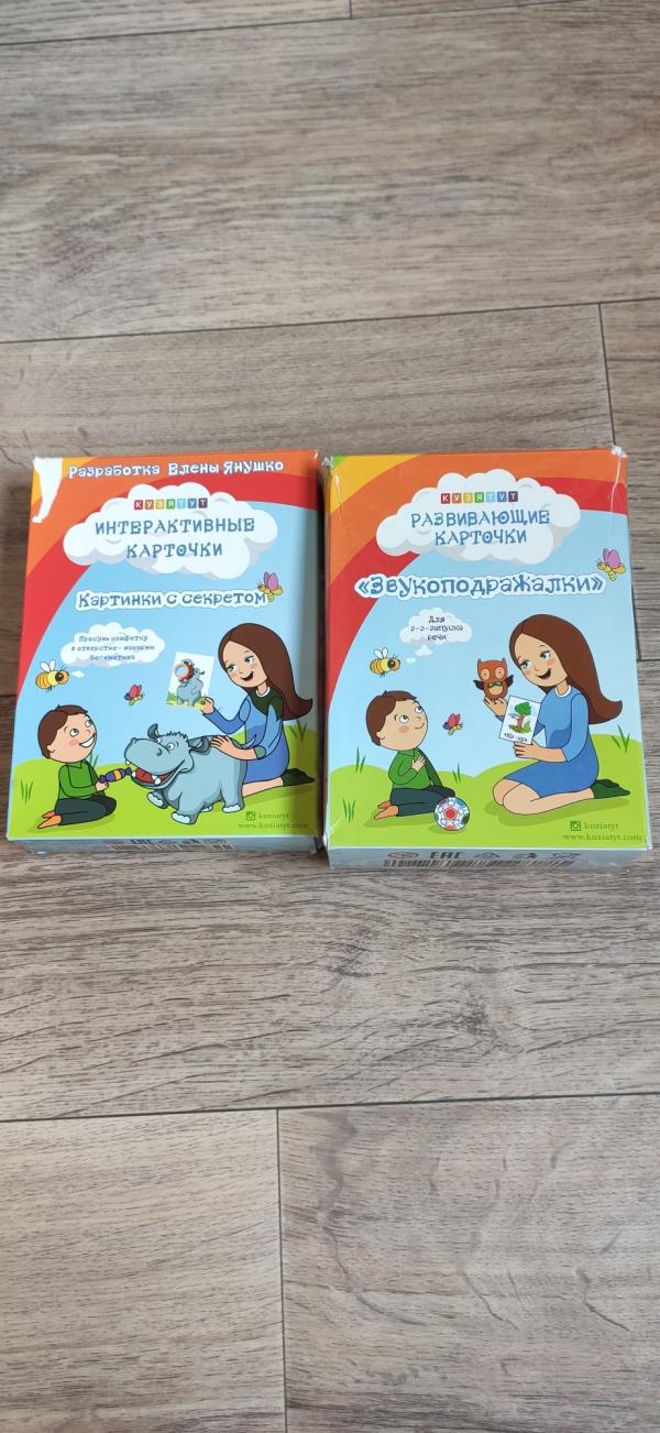 Карточки для развития речи КУЗЯТУТ (коробки заклеяны, карточки в отличном состоянии, плотные): 1. Картинки с секретом 400р, 2. Звукоподражалки 400р