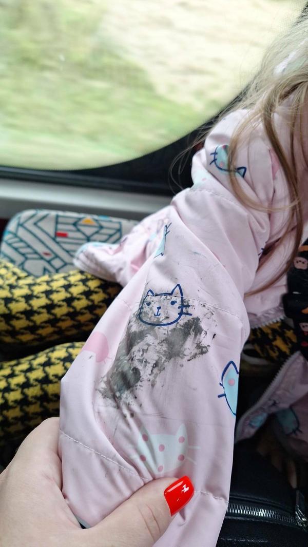 В автобусе испачкалась, отстирается ?Или всё, за новой идти ?мазута или масло, не знаю,что это,влажной салфеткой не оттирается.