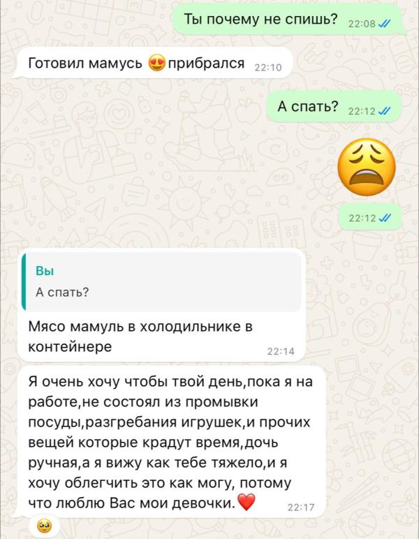 Я тоже подумала сначала что с сыном перепеска, потом по тексту поняла, что с мужем. У вас прекрасные взаимоотношения. И мои родители и семья сесты и мы с мужем можем друг друга и мамуль и папуль назвать, только в сообщениях так не пишем, а вслух сказать можем.. вообще никакого ужаса не вижу.