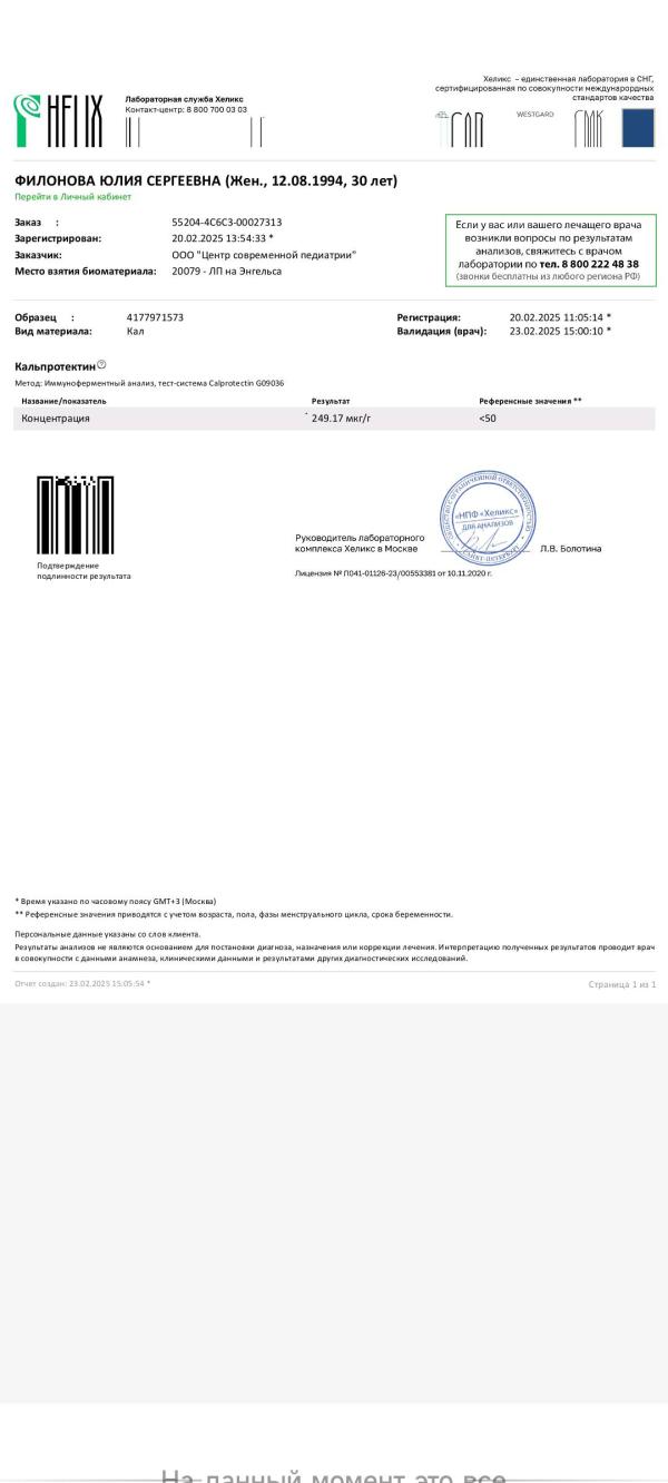 Девочки, кто понимает в этом анализе. Фекальный кальпротектин.. 250..1,5 года назал поставлен был диагноз неопределённый колит..