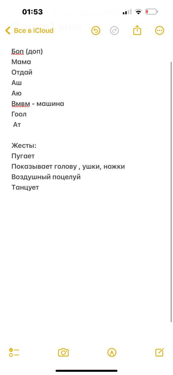 Мама, Папа, аась (агашка), аф ( 🦮), аись (алиса), дай, на, ням ням, тай тай, бум бум (машина).