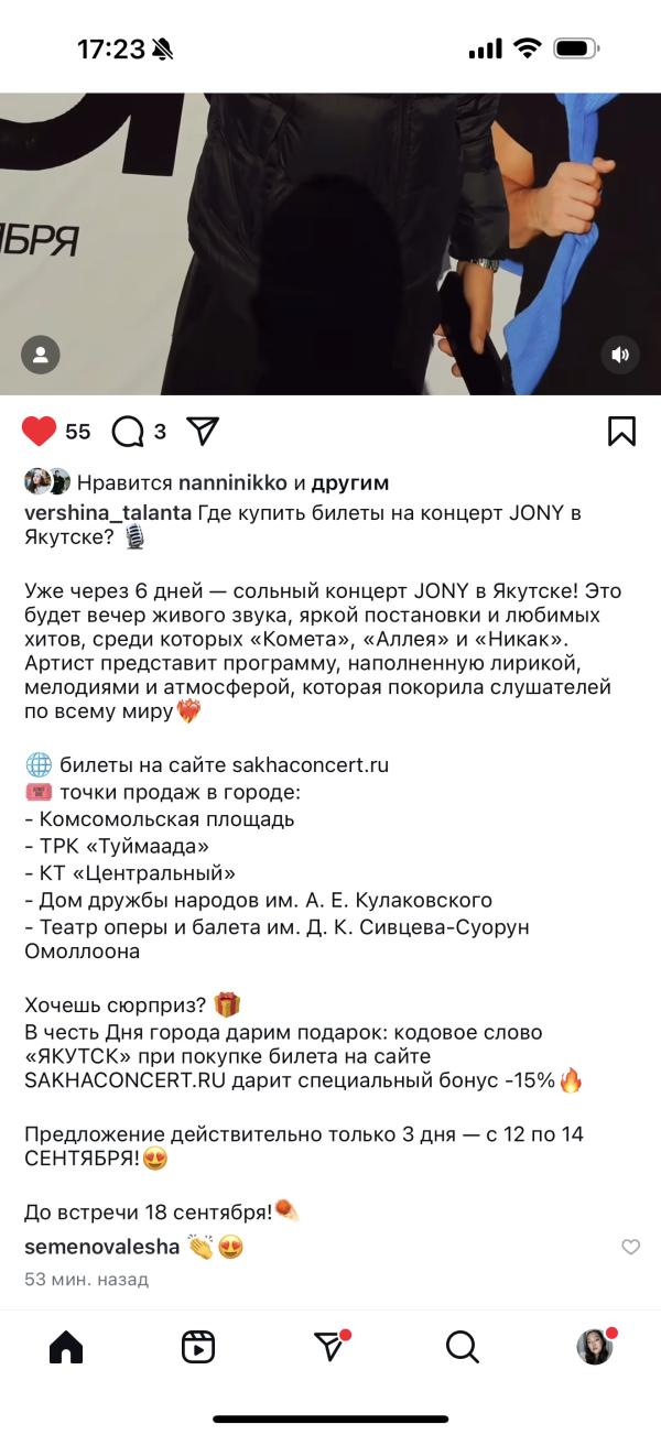 На концерт Jony появился промокод -15% «ЯКУТСК»🤩 с 12 по 14 сентября