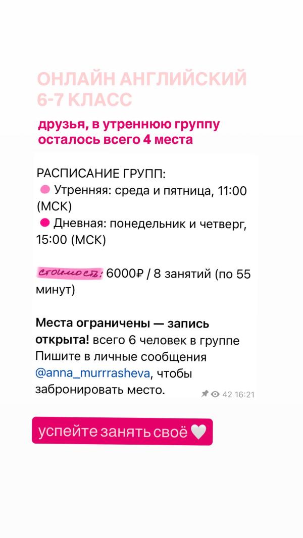 кому актуально поддерживающее онлайн репетиторство по английскому в группах, приглашаю занять своё место ❤️