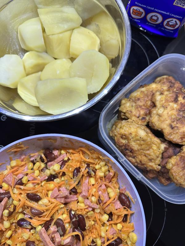 Лук и морковь пожарить. Жарила их с солью и копченой паприкой. Фасоль промыть. Все смешать.