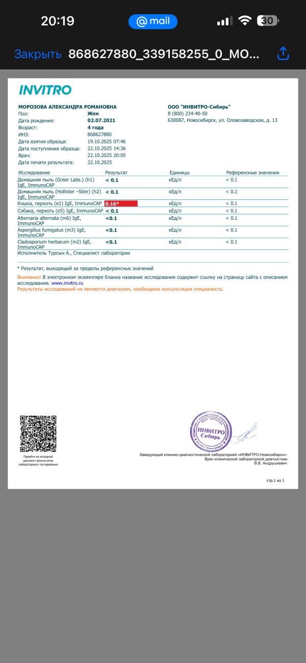 Да вот под вопросом стоял аллергический ринит. Плюс болеет очень часто. И что то врач предположила аллергены. Мы уже их года два назад сдавали была кошка в супер низком значении. Тогда подумали что переросла. А получается наоборот. 😟