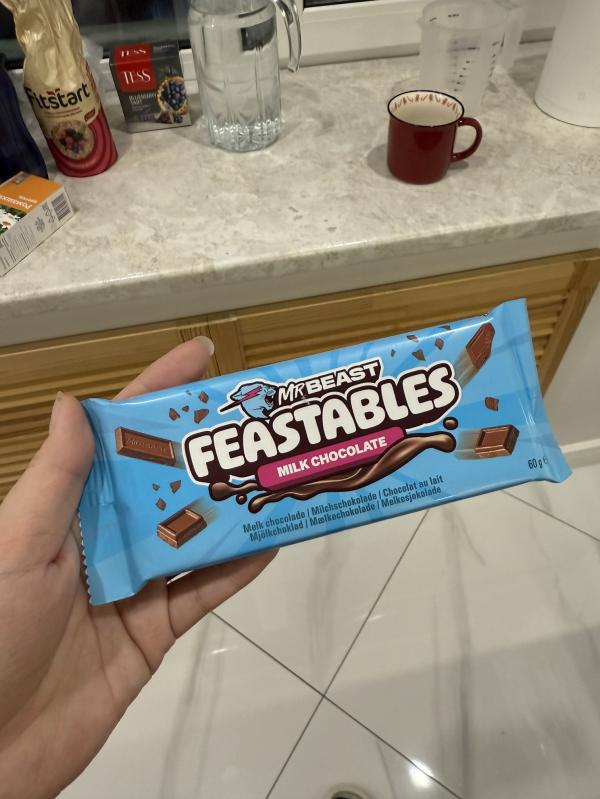 С ребенком смотрим мистера биста, все серии смотрели😄 поэтому заказали фистблс с вб. Ну так то вкусный, похож на нашу аленку и шоколад Казахстан 🤣