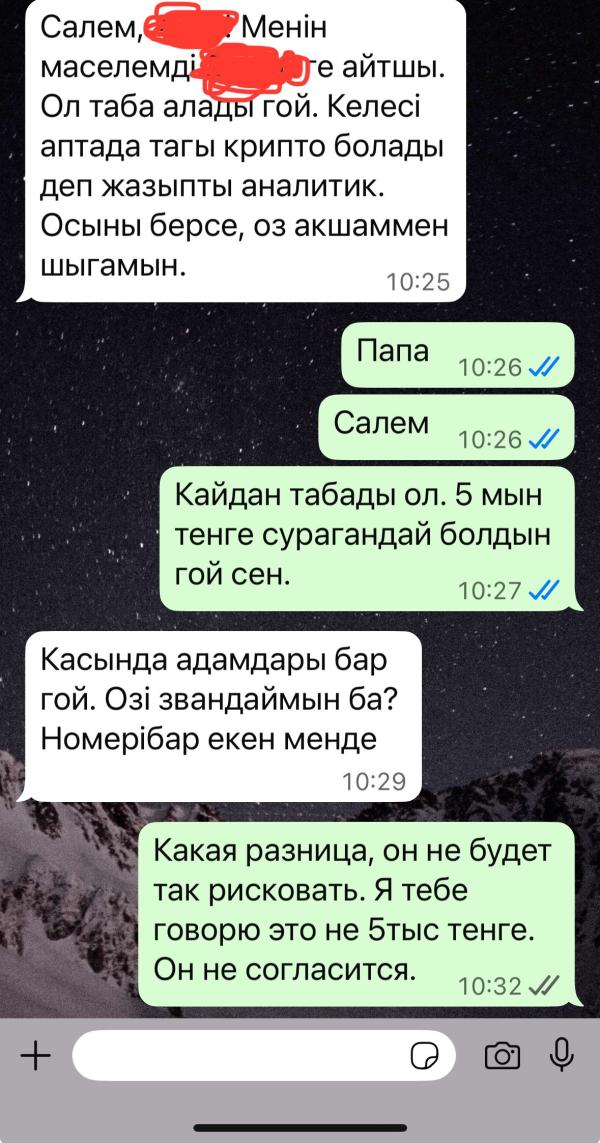 Мне осталось только блокнуть своего 63 летнего отца. Начиная с субботы каждый день просит то 5 млн, то 2,5 млн тенге. Мне уже честно без разницы, найдет он эти деньги или нет. Но скорее всего не найдет. Лишь бы меня не трогал. Устала каждый день объяснять, что это гиблое дело. Если сейчас залезет в кредит, то будет выплачивать со своей пенсии, и жена его просто выгонит из дома. Хочет теперь на прямую у моего мужа попросить денег.
