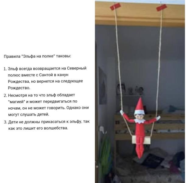 Утром получает задание в Адвенте , если выполнит эльф приносит подарок , если нет или плохо выполнит устраивает проказы