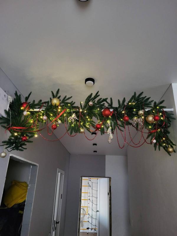 Я бы побольше веток елки добавила, чтобы закрыть белые проплешины сильнее. Или чаще попробовать эту намотать.