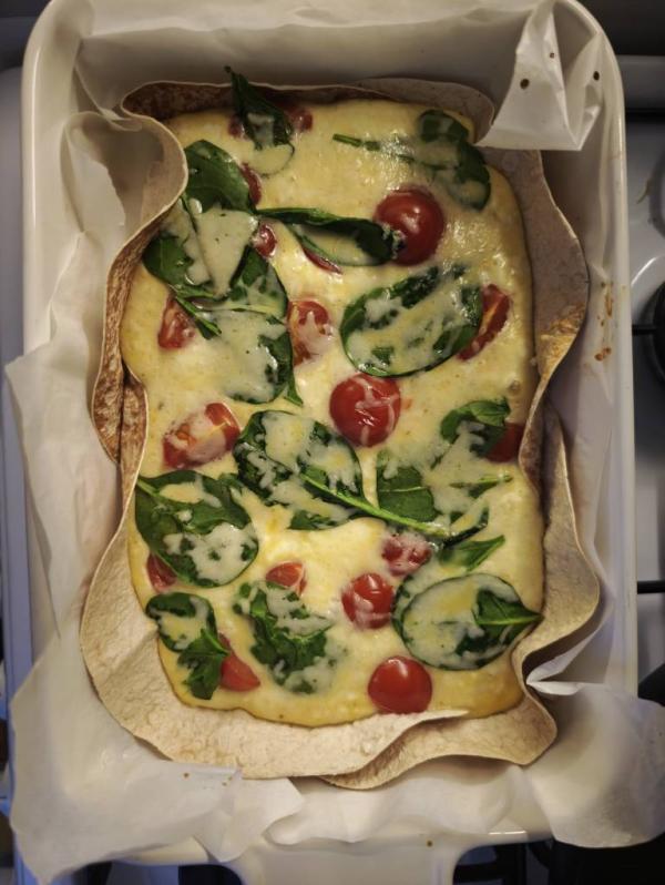 Лаваш выкладываю на пергамент. 3 яйца и творог 3 ложки, соль, перец, смешать отдельно и залить к лавашу. Затем порезать чери, добавить шпинат, и сыр. В духовку на 15-20 мин.