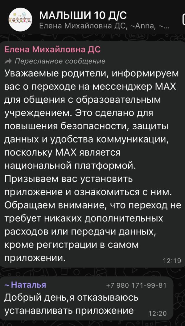 Нашей школе тоже сказали удалить все другие чаты с учителем и общаться только в Максе... я не скачиваю, подожду, чем дело кончится. Заблочат ВА и Телегу, тогда подумаю