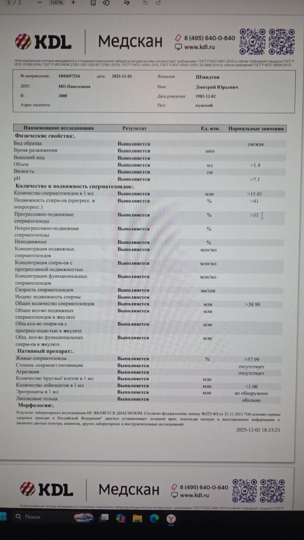 Мамс, нужен совет. Спермограмма… Не могу понять- «Выполняется» это значит что результата еще нет что ли??? Как понять??? Или итог в колонке «нормальные значения»? Кто тоже сдавал спермограмму в КДЛе?