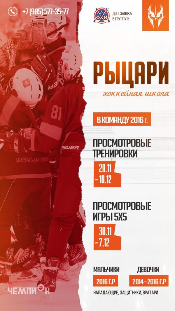 Хоккейный клуб Рыцари приглашает на БЕСПЛАТНЫЕ просмотровые тренировки с 1 по 10 декабря и на просмотровые игры 7 декабря игроков 2016 г.р. всех амплуа для участия в Кубке Москвы (Группа Б).
