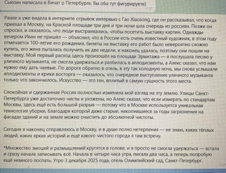 На этой неделе к нам приезжали партнеры из Китая, в России были впервые. Уехали только вчера. И вот что одна из них написала коллеге утром в чат. Такой теплый и приятный взгляд на Петербург со стороны.