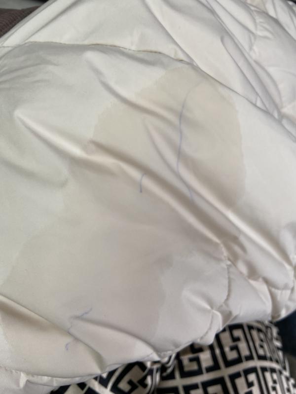 Может если свежее было бы справились, а это были в гостях, ребенок делал уроки и куртку мою отнес повесить видимо с ручкой в руках, заметила дома только