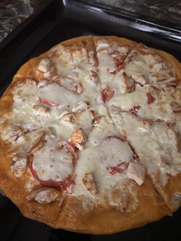 Вчера в 12 ночи приготовила пиццу . Ну это был наш поздний ужин 😋 . Курица , помидоры , сыр моцарелла , соус ( томат майонез ) я еще добавляю яйцо для сочности , но оно там не чутвтуется именно как яйцо .