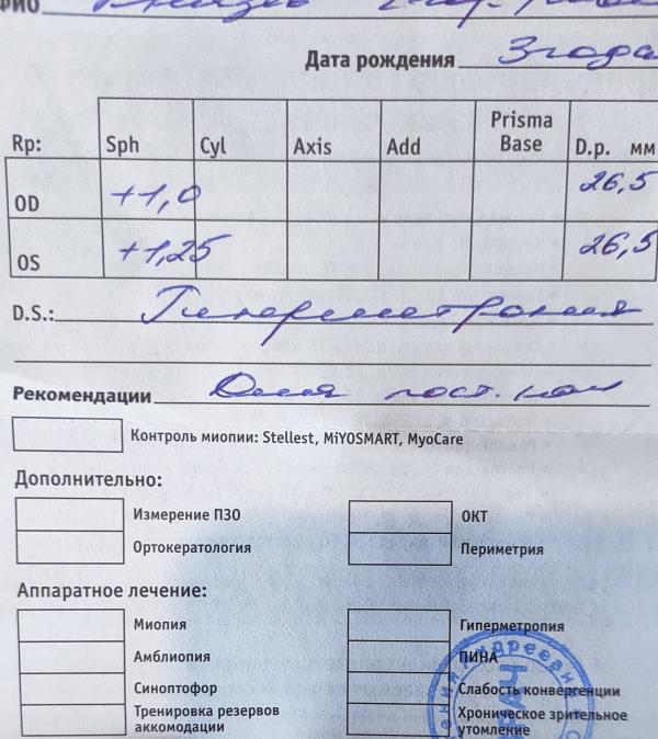 Меня немного смущает распиаренность этого доктора и стоимость приёма. Очки доктор прописал носить хотя бы по пол дня. Через 3 месяца перепроверим