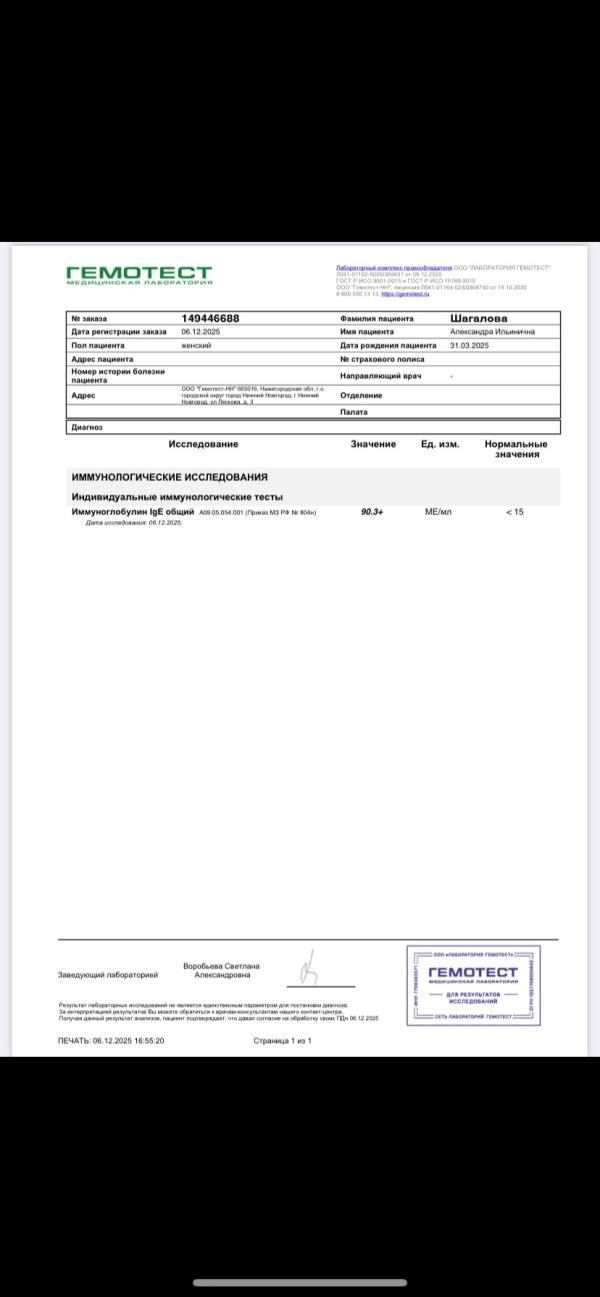 @shagalova2525 Здравствуйте. Аллергия на кота зашкалила. Придется отдавать 🥹 и чуть среагировала береза, яйцо. Белок эозинофильный тоже огромный. Сейчас отойдет от кота, будем паразитов смотреть