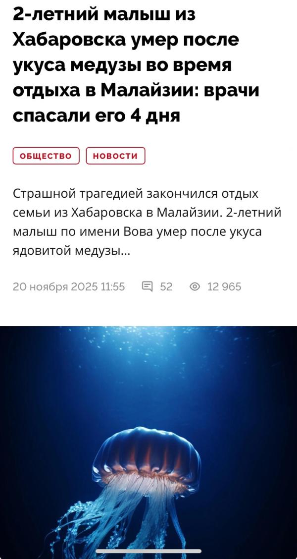 Мужа 2 года назад у нас на русском острове укусила медуза-крестовик, лежал в больнице несколько дней, а заграницей вообще страх😳😳😳