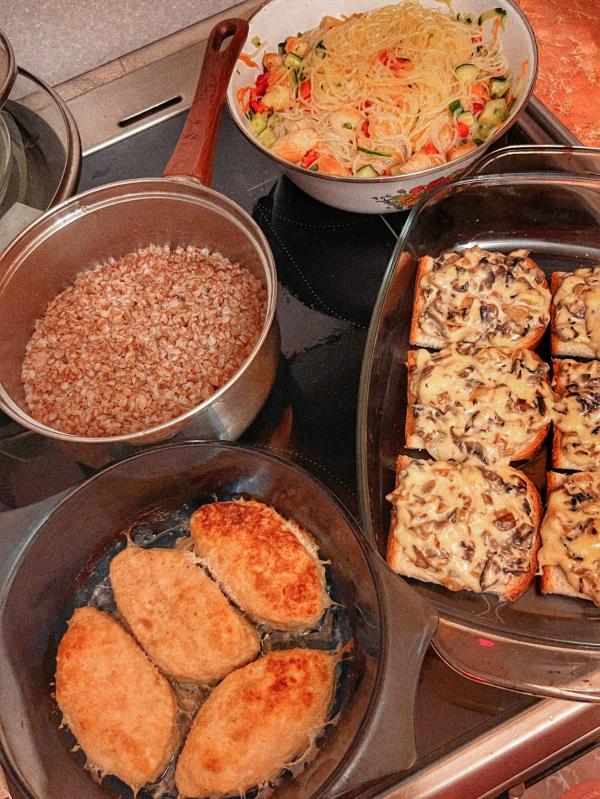 Греча с котлетами,салат фунчоза и запеченые бутерброды с шампиньонами и сыром 😋