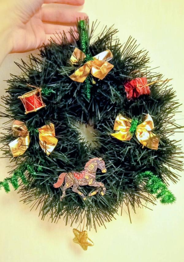 Новогодний венок для школьной выставки! Колхозно конечно, но зато с душой 😂 Особенно горжусь зелёными спиральками по бокам, считаю, они придают этому произведению особый шарм 😂