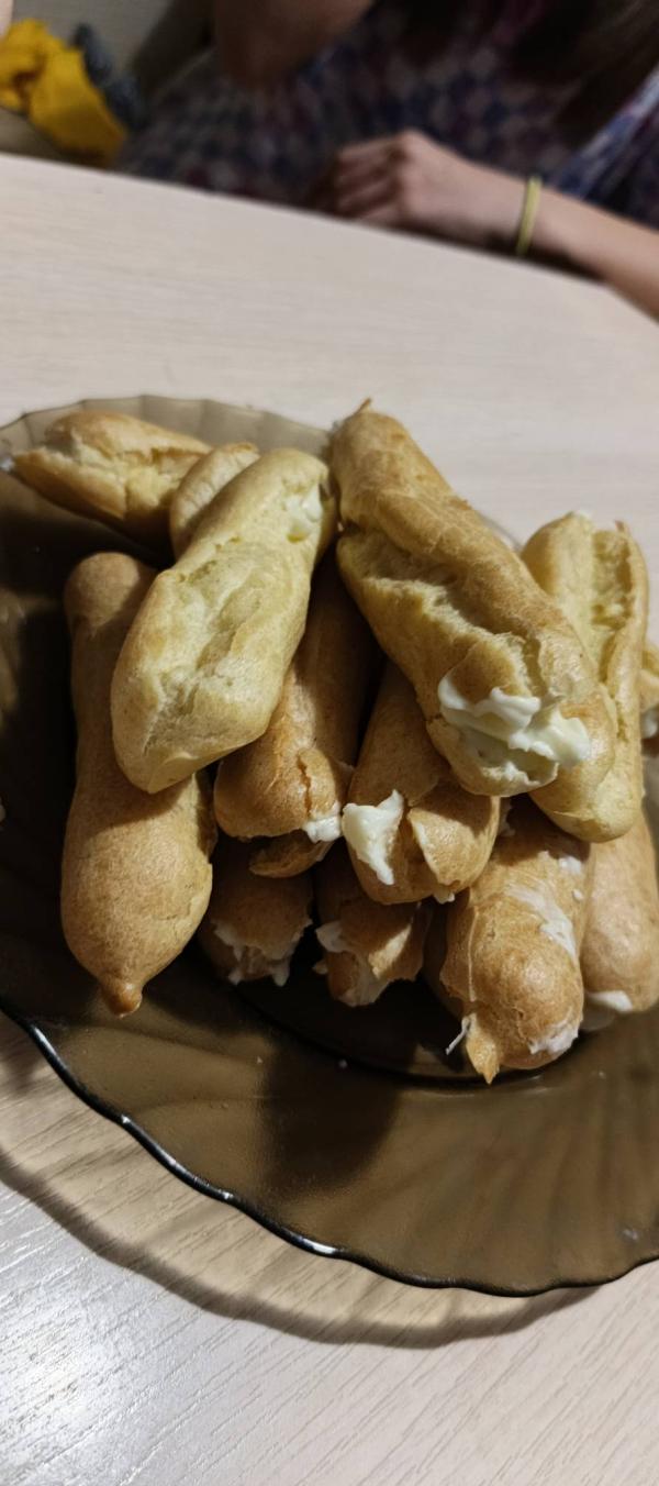Так. Теперь я всё понЯла. Похерила где-то длинную насадку. И надо насадку для эклеров. Поняла, что масляный крем мне всё-таки не нравится. Буду пробовать другие. Доброй ночи
