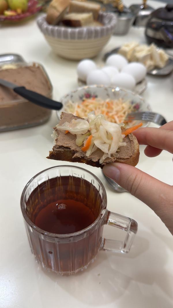 У кого что на завтрак? У меня яйца варенные и бутерброды с печеночным паштетом и квашенной капустой